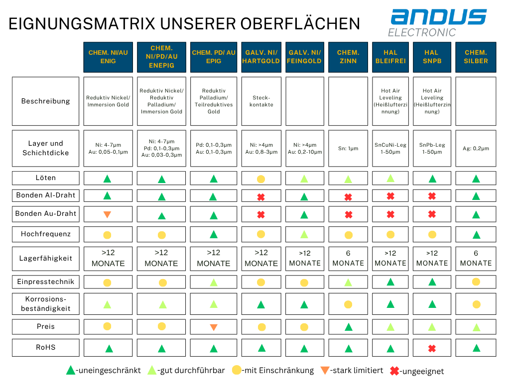 ANDUS ELECTRONIC bietet dafür chemische und galvanische Oberflächen: Gold, Zinn, Silber und Kupfer zählen zur breiten Auswahl. Hier wird in verschiedene Varianten unterteilt, wobei jede Oberfläche Ihre eigenen Vorteile hat. Weitere Optionen sind Carbonlack sowie  selektive und kombinierte Oberflächen. Im Folgendem wird eine detaillierte Übersicht über unser Portfolio vorgestellt.